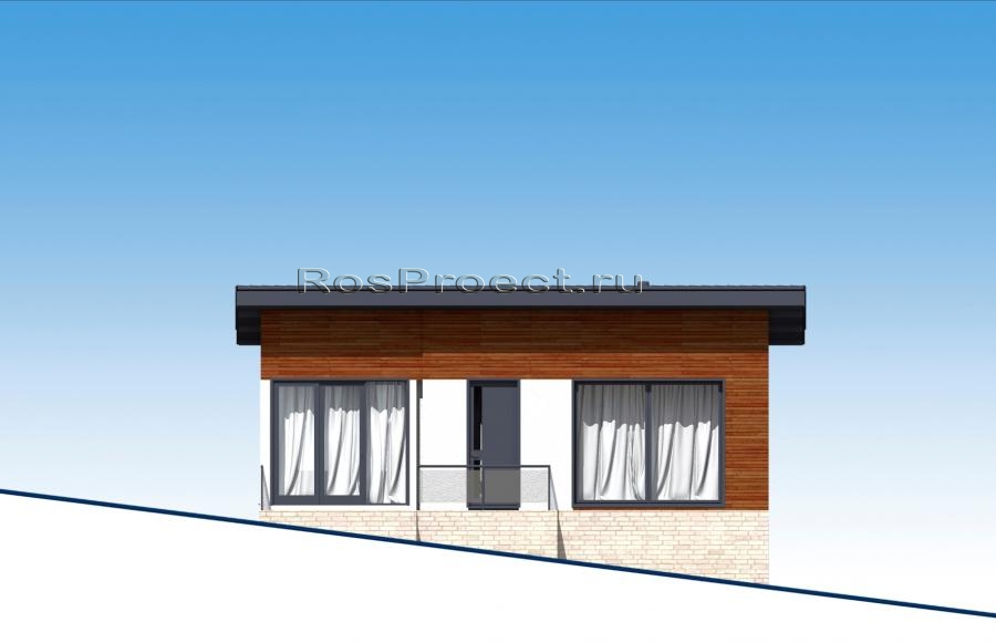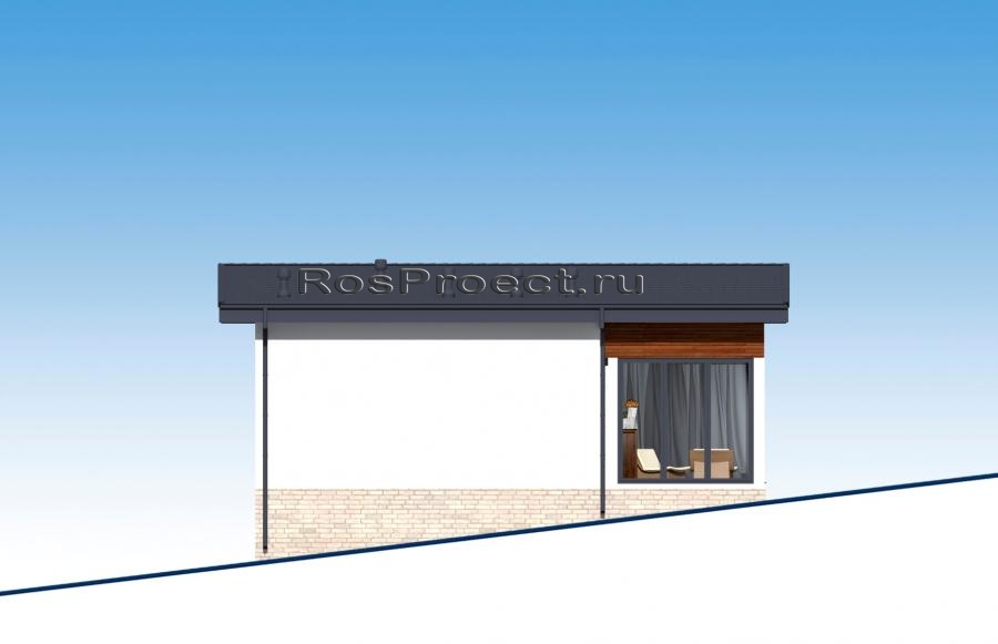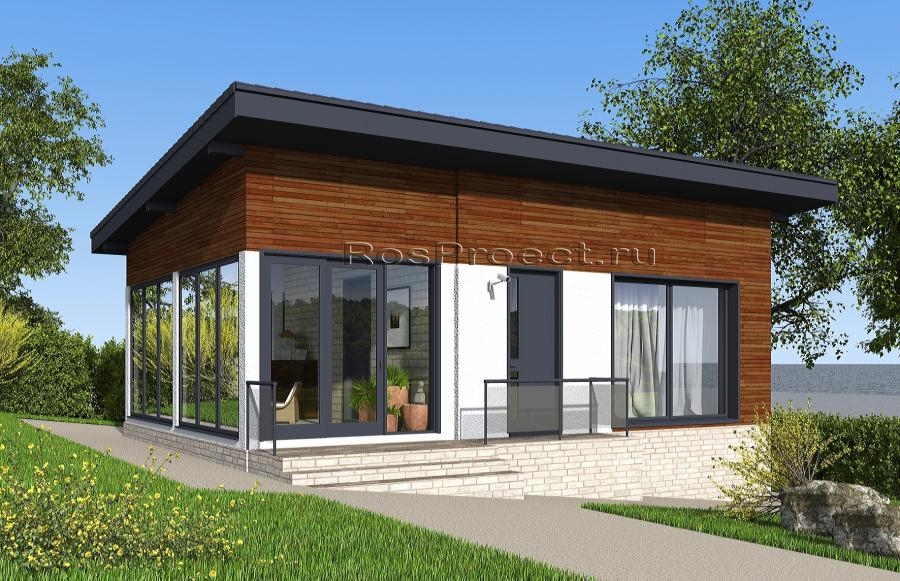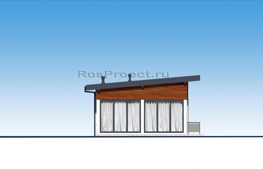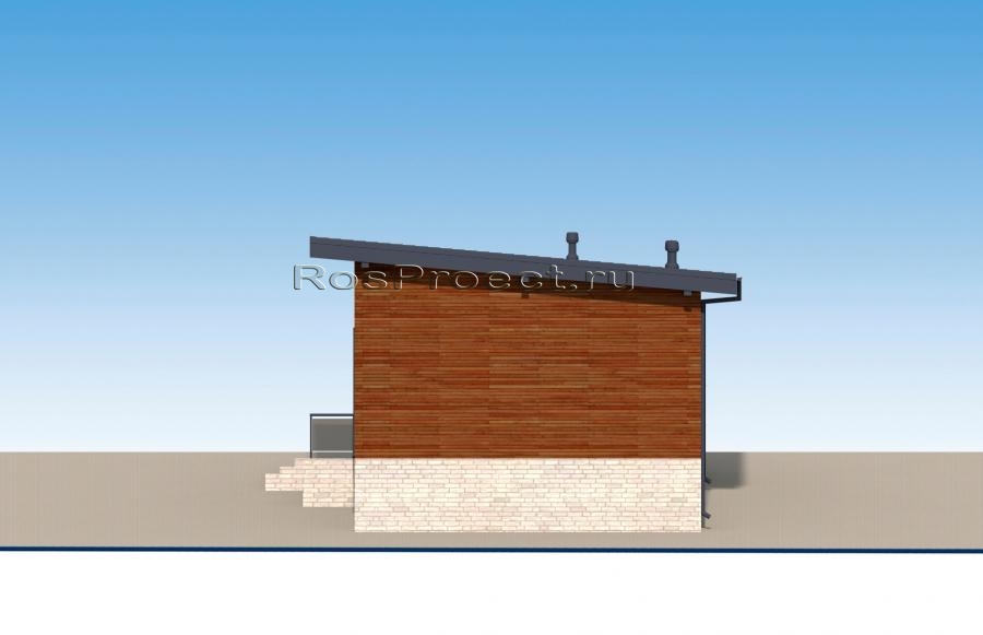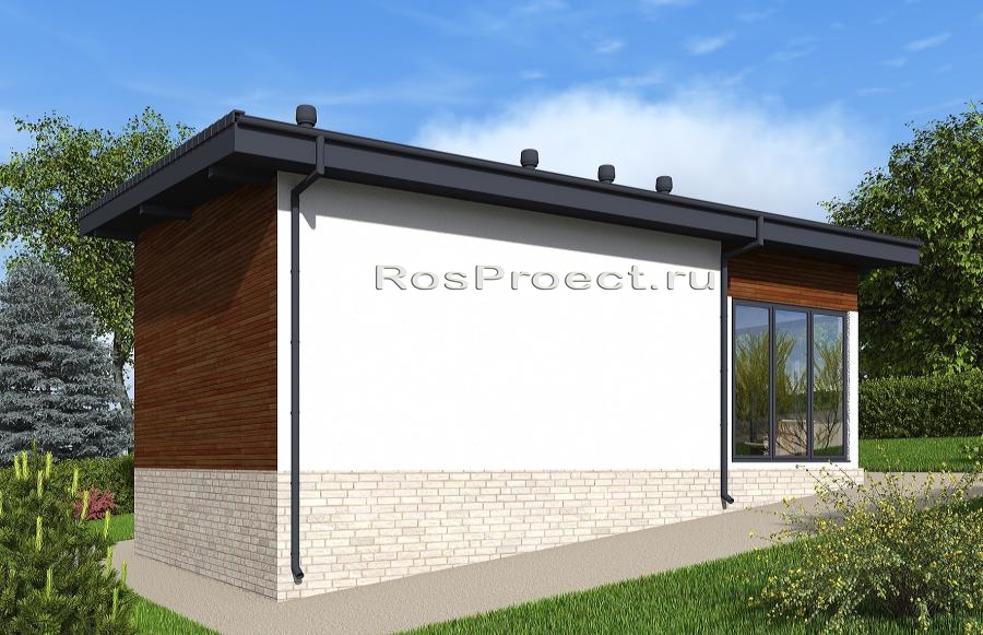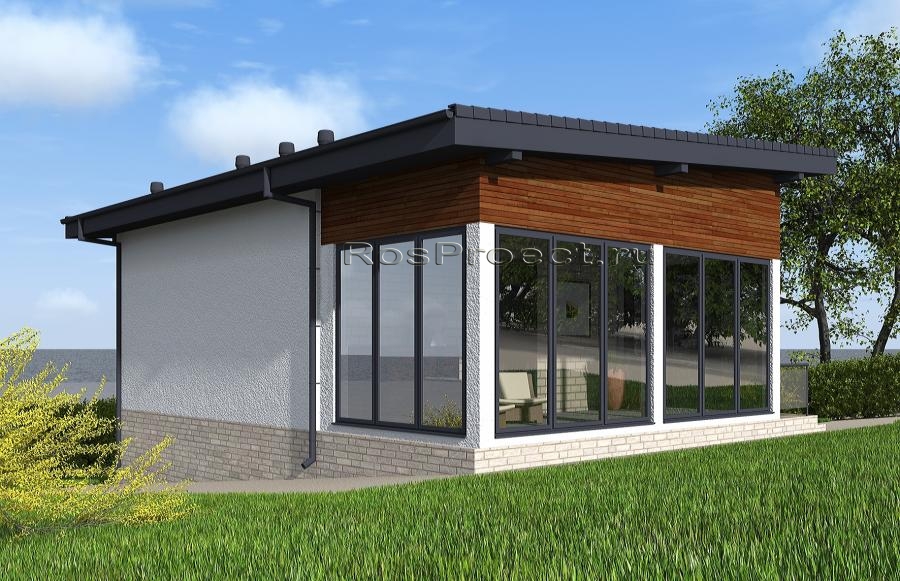 Баня с верандой и панорамным остеклением с габаритами 7,88 x 10,10 м. Наружная отделка здания – сайдинг под штукатурку, планкен, облицовочный кирпич. Фундамент - монолитная ж/б плита под всей площадью дома с ребрами под несущие стены. Наружные стены – газобетонные блоки с утеплением минеральной ватой, отделкой сайдингом по обрешетке и облицовочным кирпичом с воздушным зазором. Перегородки - пустотелый кирпич. Пол этажа - пол по монолитной плите. Чердачное перекрытие - деревянные балки с теплошумоизоляцией в межбалочном пространстве. Крыша - односкатная. Кровля - битумная черепица. Окна — металлопластиковые